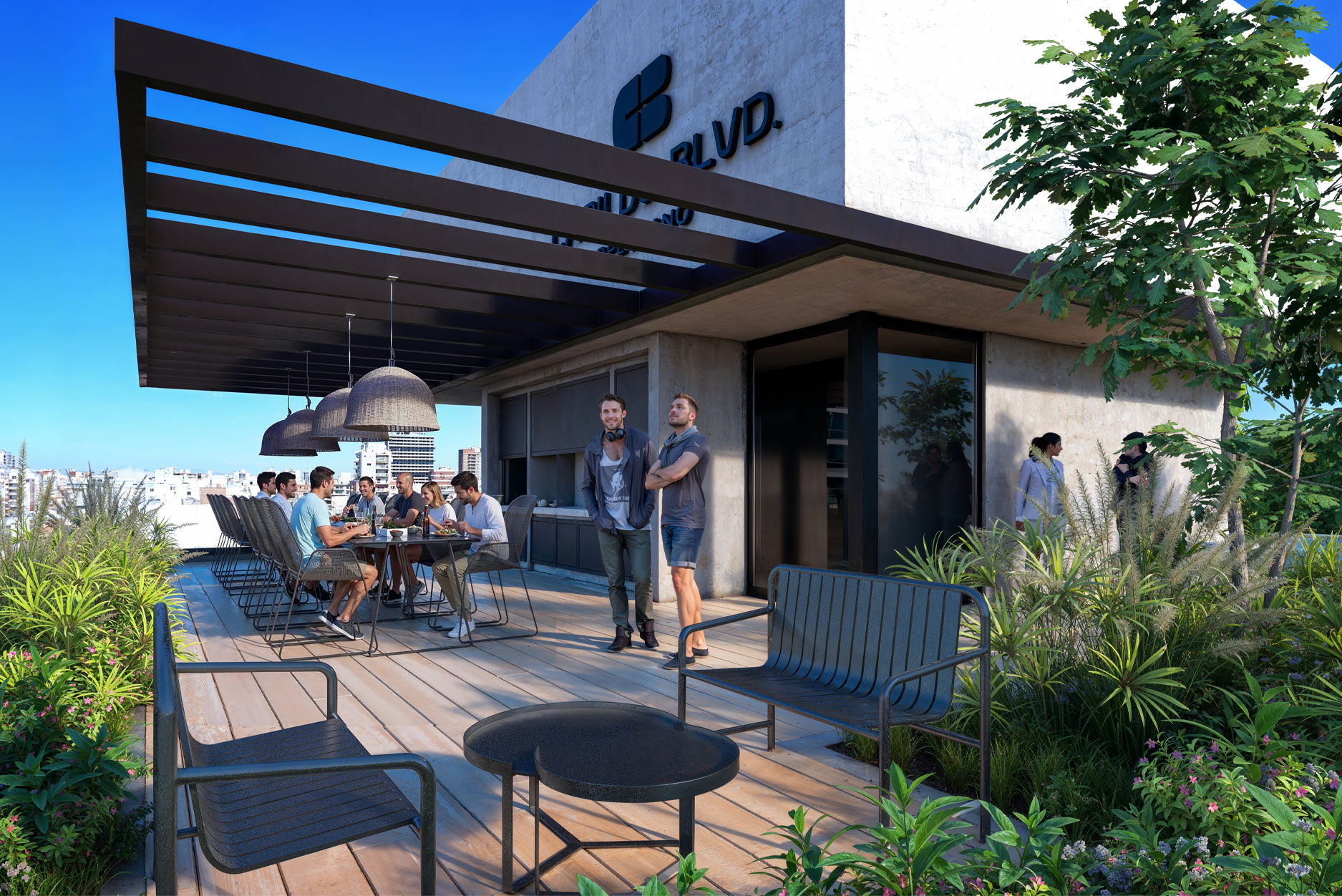 Piscina con solárium, SUM con terrazas, coworking y gimnasio